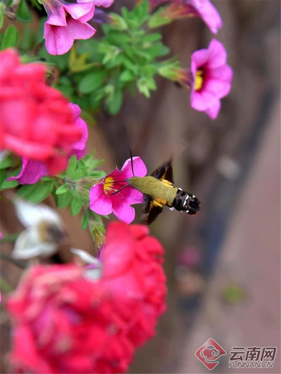 8月22日下午,摄影爱好者黄先生在通海县兴蒙乡百花巷内,看到花丛中有几只长相怪异的昆虫在飞,这种昆虫身形像蜜蜂,体长只有花生大小,背部前半段为土黄色,尾部为褐色,间杂白色。其翅膀像蝴蝶,和小鸟一样的尾翼不停地摆动,发出清晰的嗡嗡声,身体悬停在空中,在同一朵花上停留片刻,然后“嗡”的一声飞到另一朵花上,速度非常快。头上有两根尖端膨大的触角,约两厘米长的喙管插入花中吸食花蜜,一眼看上去,就像“蜂鸟”的样子。黄先生赶忙用相机拍下了这几只可爱的小昆虫在花间逗留戏嬉的精彩瞬间。