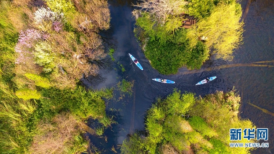 图为航拍视角下,“市民河长”划着皮划艇在滇池湖滨湿地里巡河。经过多年的持续治理,滇池流域水生态和水环境明显改善,水质企稳向好(摄于2019年3月8日)。(新华网 赵普凡/摄)
