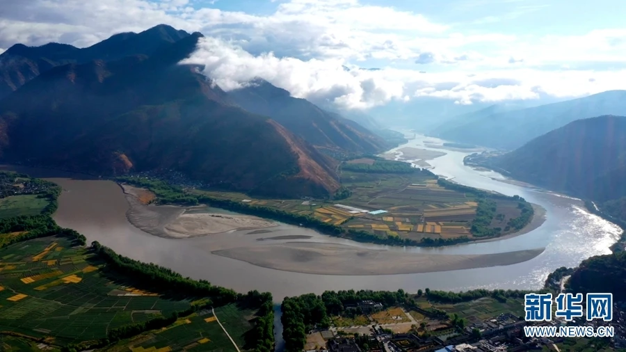 图为在丽江市玉龙县石鼓镇拍摄的“长江第一湾”。与“江流到此成逆转,奔入中原壮大观”同样令人惊叹的,是江边绵延数百里的柳林,它们如同一条绿色的飘带,与江水相映成趣(摄于2020年4月21日)。(新华网 赵普凡/摄)