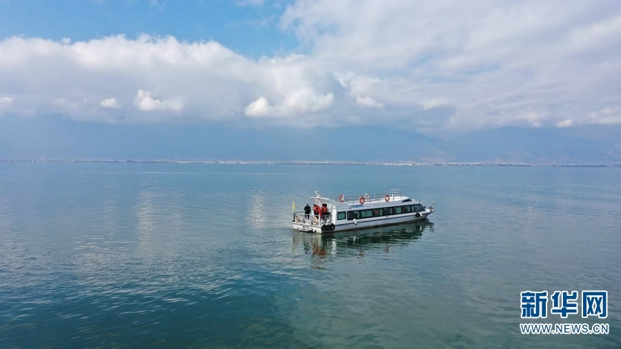 洱海,是大理的“母亲湖”,也是无数游客向往的“诗和远方”。在洱海之上,常年活跃着一群上海交通大学云南(大理)研究院的“治水人”。图为航拍视角下,研究人员在洱海水面进行采样工作(摄于2020年12月10日)。(新华网 赵普凡/摄)