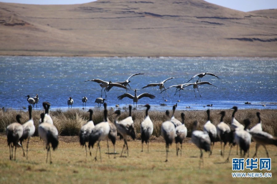 图为云南大山包黑颈鹤。国家一级重点保护野生动物黑颈鹤,被誉为“鸟中大熊猫”,云南大山包黑颈鹤国家级自然保护区是黑颈鹤重要的越冬地和中转地(2021年3月19日摄)。(新华网 赵普凡/摄 )
