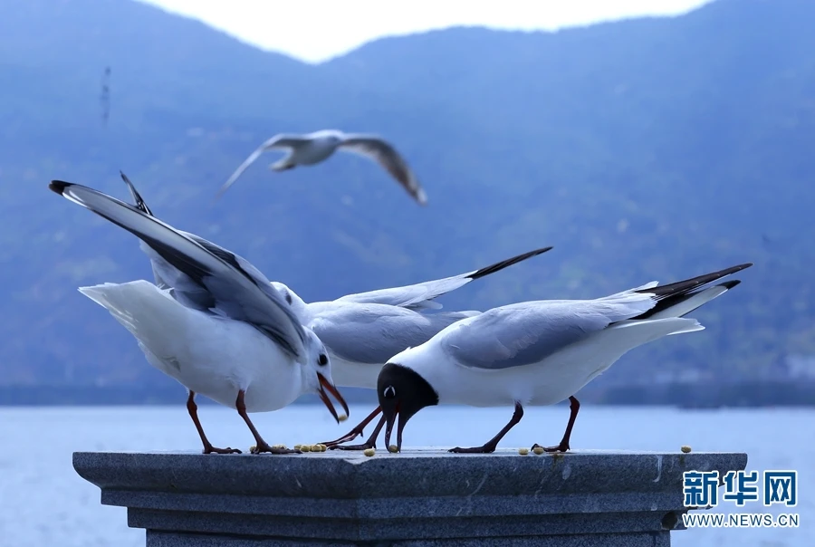图为昆明海埂大坝正在啄食的红嘴鸥。作为春城的“老朋友”,自1985年起,红嘴鸥已连续36年迁徙到昆明过冬(摄于2021年3月12日)。(新华网 念新洪/摄)