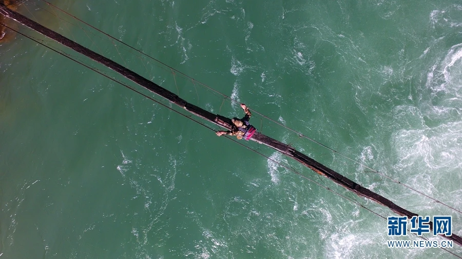 一名生态护林员行走在横跨独龙江的一座桥上(2019年11月7日摄)。(新华网 赵普凡/摄)