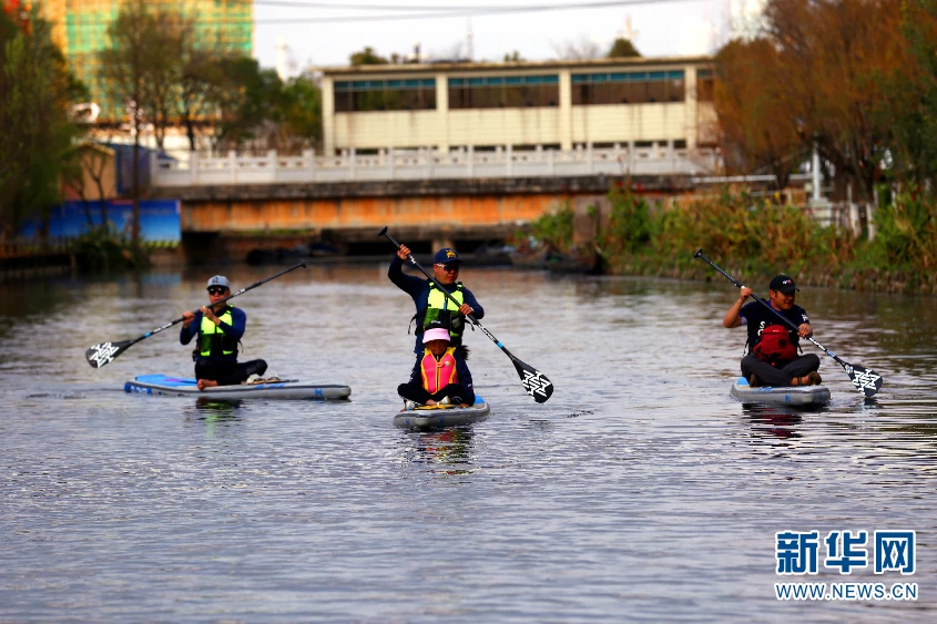 滇池湖滨湿地里,3位“市民河长”正划着皮划艇巡河。自2009年以来,昆明市已招募4届“市民河长”,他们成为滇池保护中重要的民间力量(摄于2019年3月8日)。(新华网 赵勇/摄)