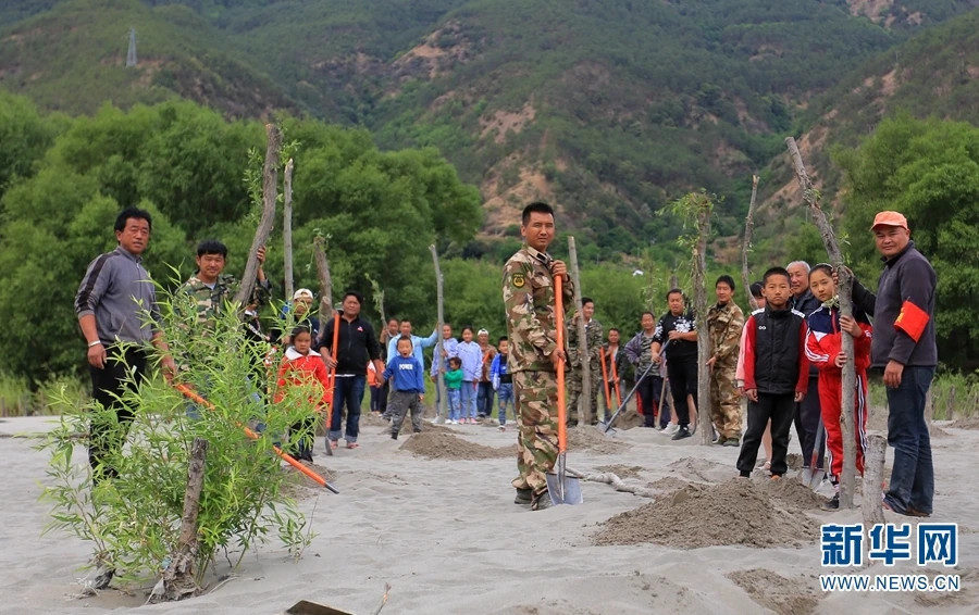 图为和朝明(中)带领群众在金沙江边种植柳树。金沙江边郁郁葱葱的柳林,凝聚着沿岸几代村民的汗水和心血。石鼓镇林业工作站站长和朝明,是种柳人队伍里的中坚力量,8年来,他带领群众在江边种下10万余株柳苗,用一抹抹新绿,为长江上游的生态环境保护“添砖加瓦”(摄于2020年4月22日)。(新华网 丁凝/摄)