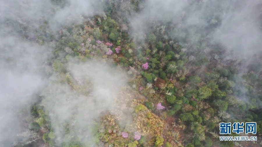 图为航拍视角下的丽江老君山九十九龙潭景区,粉色部分为盛放的杜鹃花。老君山国家公园位于丽江市西部,是世界自然遗产“三江并流”的八大片区之一,也是大滇西旅游环线的重要组成部分(摄于2020年4月25日)。(新华网 赵普凡/摄)
