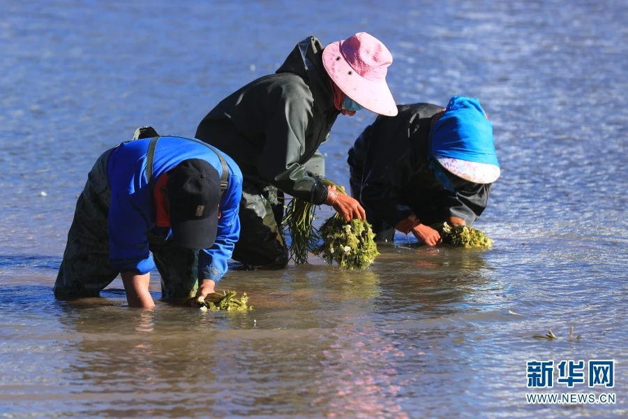 图为大理州洱源县右所镇松曲村,村民们正在种植基地里采收海菜。近年来,为了保护洱海,洱海县砍掉了大水大肥的大蒜种植业,转而培育绿色生态产业,海菜种植就是其中之一(摄于2020年12月13日)。(新华网 丁凝/摄)
