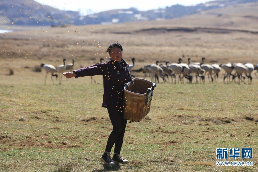 图为陈光会在给黑颈鹤喂食玉米粒。陈光会是昭通市昭阳区大山包镇车路村村民,2004年,她从婆婆手中接过志愿保护黑颈鹤的接力棒,成为大山包的“鹤妈妈”(2021年3月19日摄)。(新华网 赵普凡/摄)