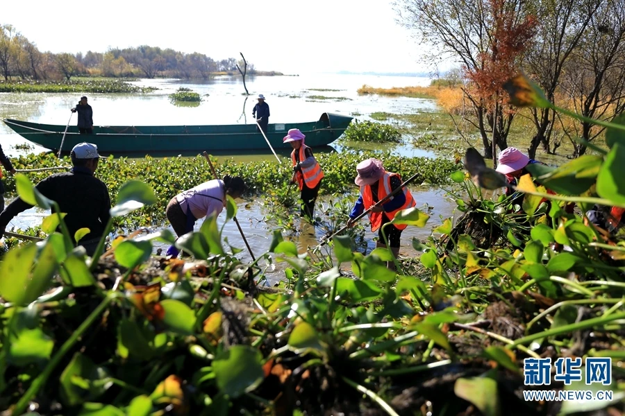 图为洱海滩地管理员正在打捞水葫芦。洱海滩地管理员岗位设立于2004年,主要负责水葫芦打捞、死亡水草清除、白色垃圾和漂浮物清理等工作(摄于2020年12月8日)。(新华网 丁凝/摄)