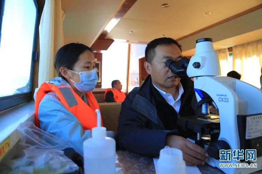 图为上海交通大学云南(大理)研究院院长王欣泽(右)在用显微镜观测洱海藻类情况。自2007年起,王欣泽就扎到洱海边,开展湖泊保护治理研究工作,大量的科研成果,被用于洱海保护治理当中(摄于2020年12月10日)。(新华网 赵普凡/摄)