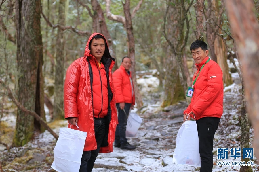 丽江老君山九十九龙潭景区,杨春龙(左1)和同事们正顺着栈道捡拾垃圾。他们长期驻扎在老君山上,既是景区的导游,也承担着巡山护林、捡拾垃圾、守护“生态宝库”的任务(摄于2020年4月25日)。(新华网 丁凝/摄)