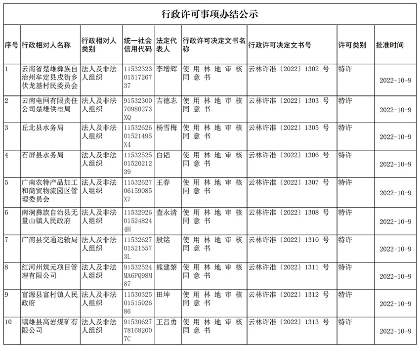 云南省林业和草原局行政许可事项办结公示(2022年10月9日)