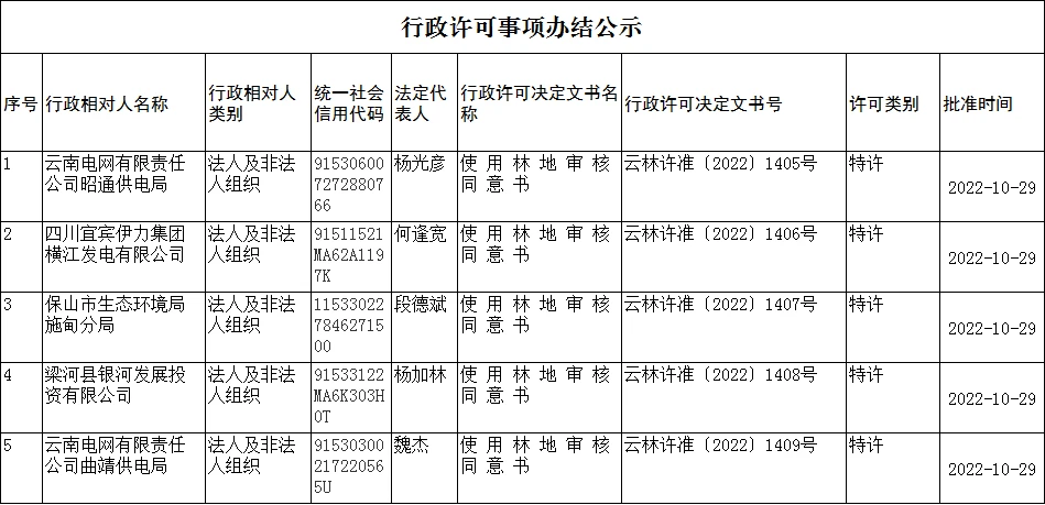 云南省林业和草原局行政许可事项办结公示(2022年10月29日)