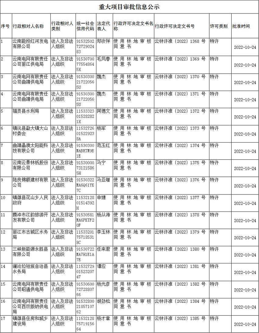 云南省林业和草原局重大项目审批信息公示(2022年10月24日)
