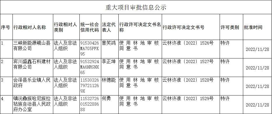 云南省林业和草原局重大项目审批信息公示(2022年11月28日)