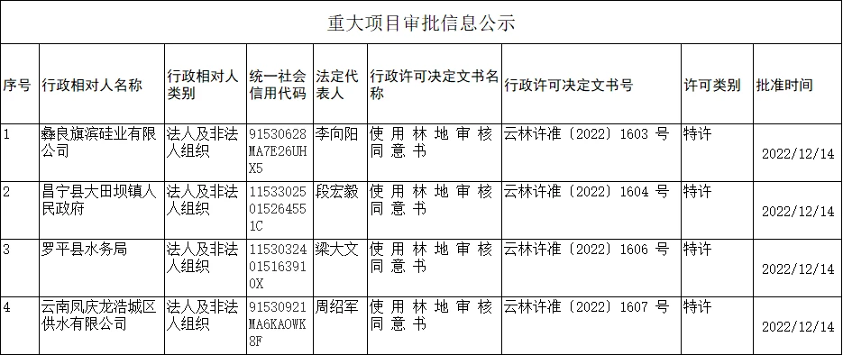 云南省林业和草原局重大项目审批信息公示(2022年12月14日)