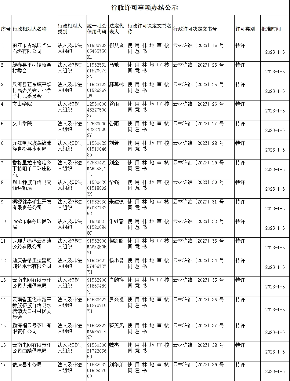 云南省林业和草原局行政许可事项办结公示(2023年1月6日)