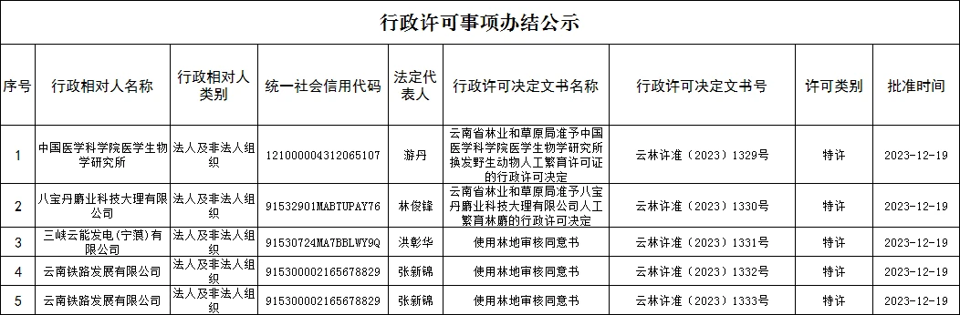 云南省林业和草原局行政许可事项办结公示(2023年12月19日)