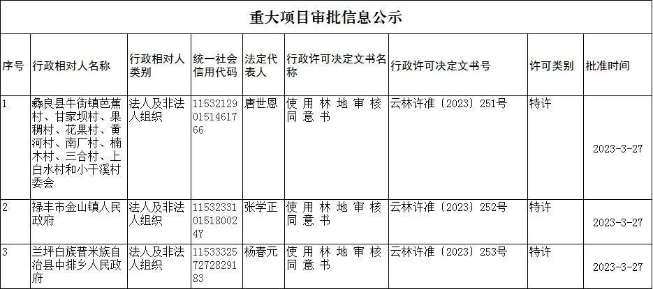 云南省林业和草原局重大项目审批信息公示(2023年3月27日)