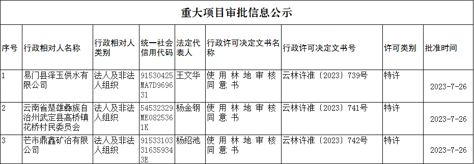 云南省林业和草原局重大项目审批信息公示(2023年7月26日)