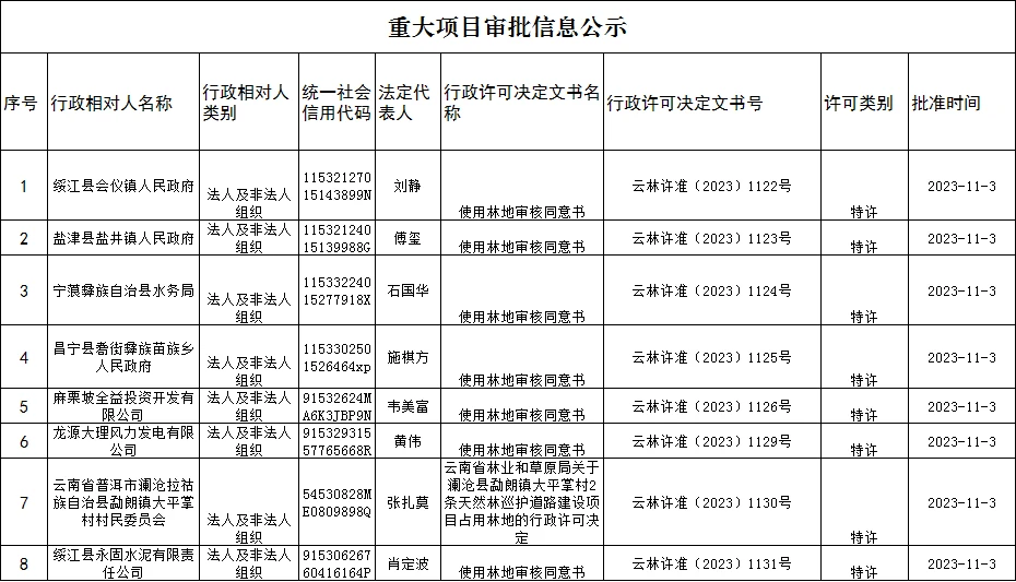 云南省林业和草原局重大项目审批信息公示(2023年11月3日)