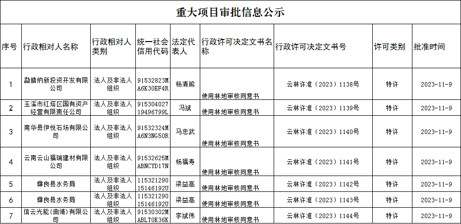 云南省林业和草原局重大项目审批信息公示(2023年11月9日)