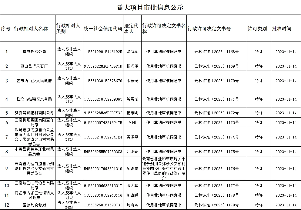 云南省林业和草原局重大项目审批信息公示(2023年11月14日)