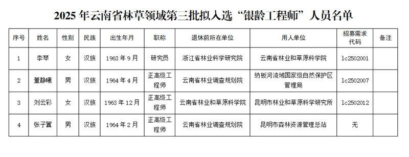 附件:2025年云南省林草领域第三批拟入选“银龄工程师”人员名单