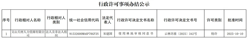 云南省林业和草原局行政许可事项办结公示(2025年10月10日)