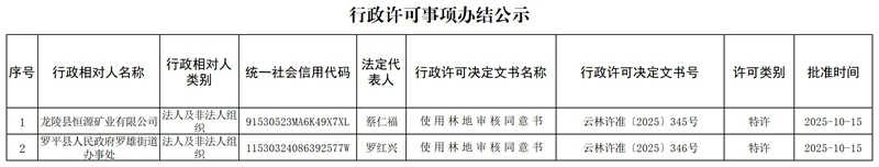 云南省林业和草原局行政许可事项办结公示(2025年10月15日)