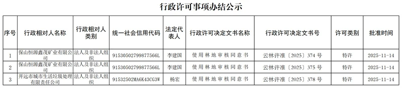 云南省林业和草原局行政许可事项办结公示(2025年11月14日)