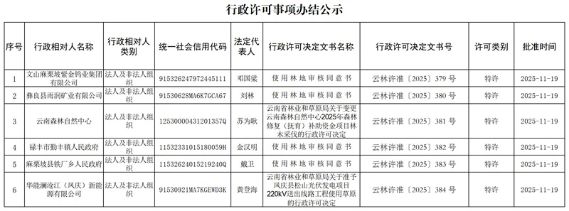 云南省林业和草原局行政许可事项办结公示(2025年11月19日)