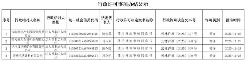 云南省林业和草原局行政许可事项办结公示(2025年11月28日)
