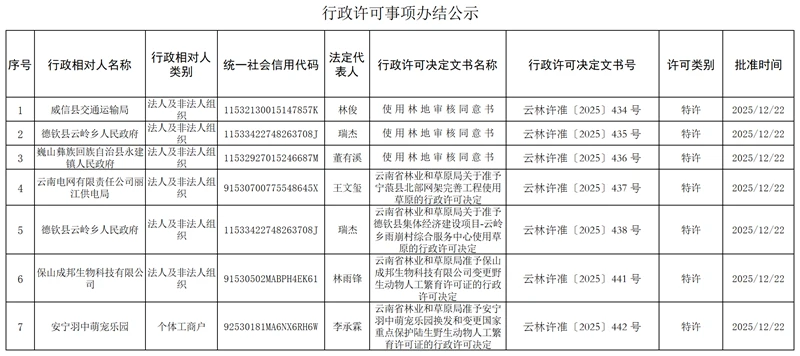 云南省林业和草原局行政许可事项办结公示(2025年12月22日)