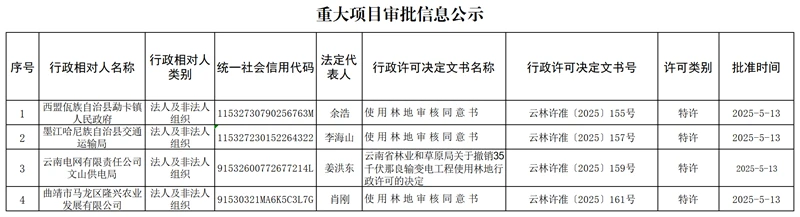 云南省林业和草原局重大项目审批信息公示(2025年5月13日)