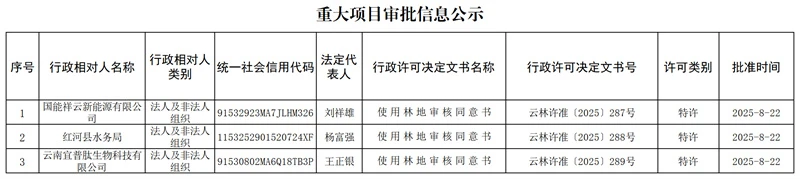 云南省林业和草原局重大项目审批信息公示(2025年8月22日)