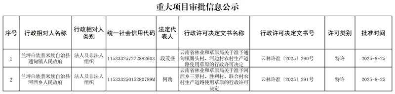 云南省林业和草原局重大项目审批信息公示(2025年8月25日)