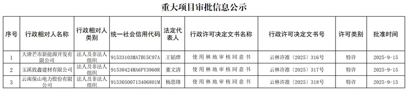 云南省林业和草原局重大项目审批信息公示(2025年9月15日)