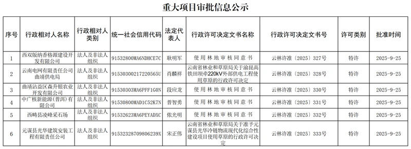 云南省林业和草原局重大项目审批信息公示(2025年9月25日)