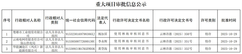 云南省林业和草原局重大项目审批信息公示(2025年10月29日)