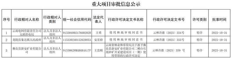 云南省林业和草原局重大项目审批信息公示(2025年10月31日)