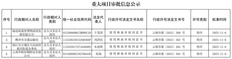 云南省林业和草原局重大项目审批信息公示(2025年11月6日)