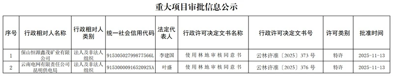 云南省林业和草原局重大项目审批信息公示(2025年11月13日)