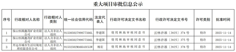 云南省林业和草原局重大项目审批信息公示(2025年11月14日)