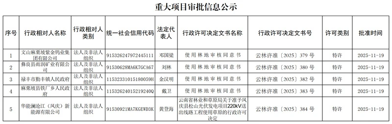 云南省林业和草原局重大项目审批信息公示(2025年11月19日)
