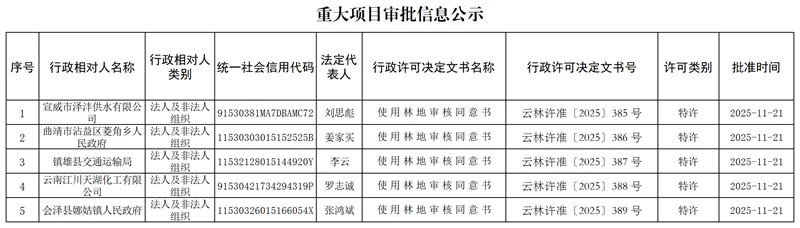 云南省林业和草原局重大项目审批信息公示(2025年11月21日)
