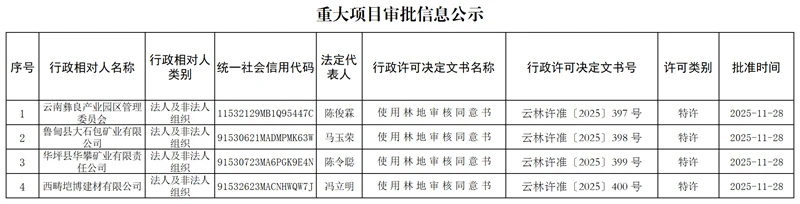 云南省林业和草原局重大项目审批信息公示(2025年11月28日)