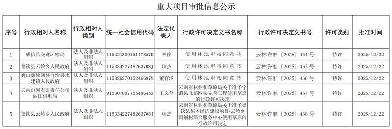 云南省林业和草原局重大项目审批信息公示(2025年12月22日)