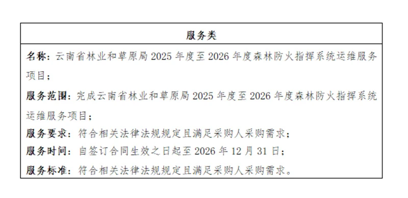 一、项目名称:云南省林业和草原局2025年度至2026年度森林防火指挥系统运维服务项目