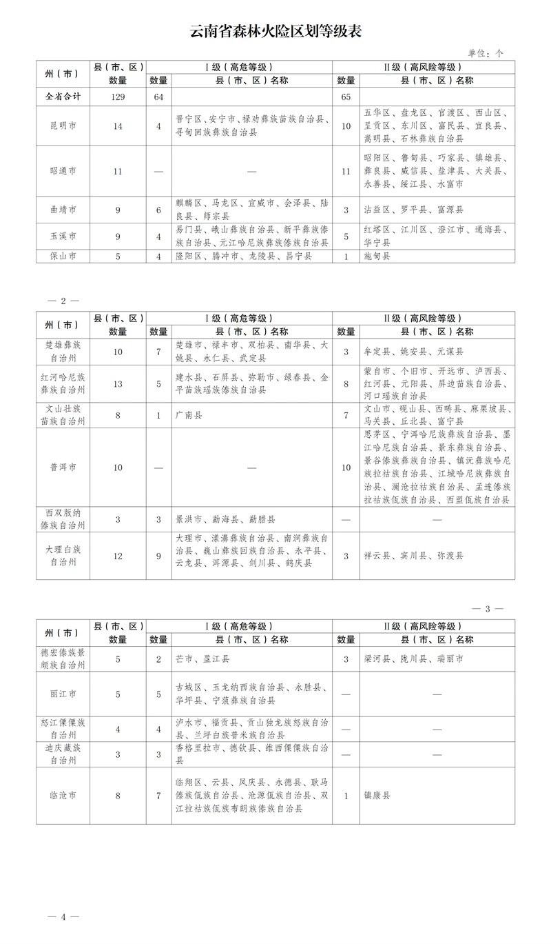 根据《全国森林火险区划等级》(LY/T 1063—2025),全国森林火险区划分为3个等级,其中:Ⅰ级火险区为高危等级、Ⅱ级火险区为高风险等级、Ⅲ级火险区为一般风险等级。按照国家林草局统一安排,省林草局组织开展了以县为单位的森林火险区划工作,形成全省森林火险区划等级成果(以下简称区划成果),全省64个县(市、区)划为Ⅰ级火险区(高危等级),65个县(市、区)划为Ⅱ级火险区(高风险等级),已报省人民政府和国家林草局备案。